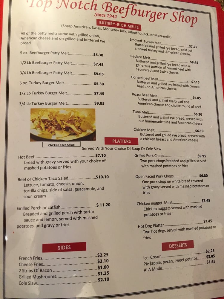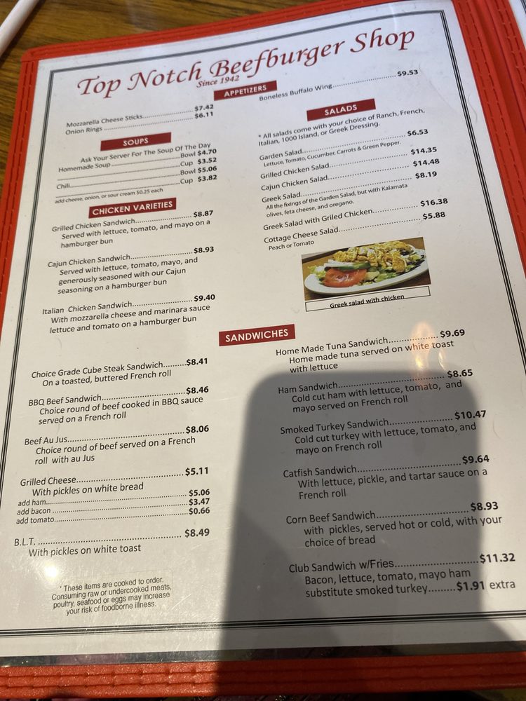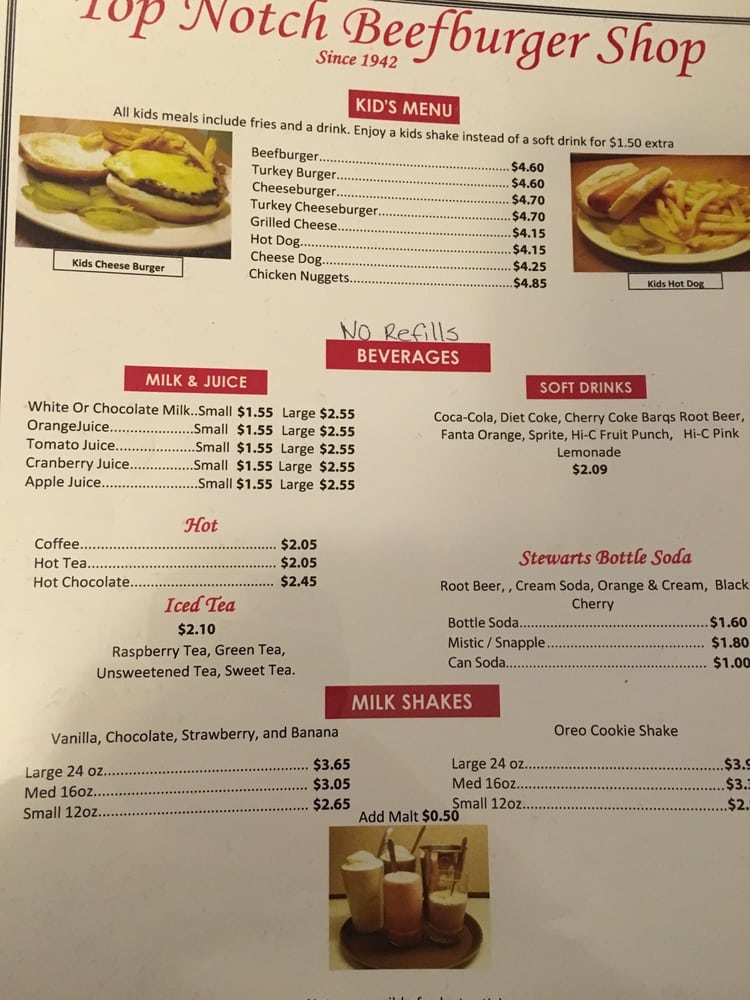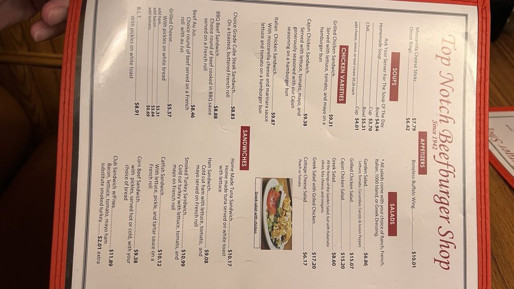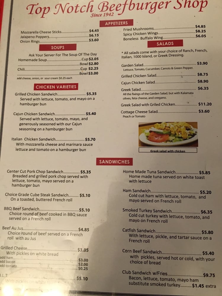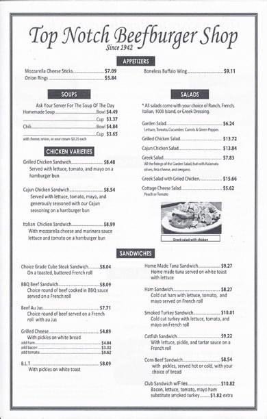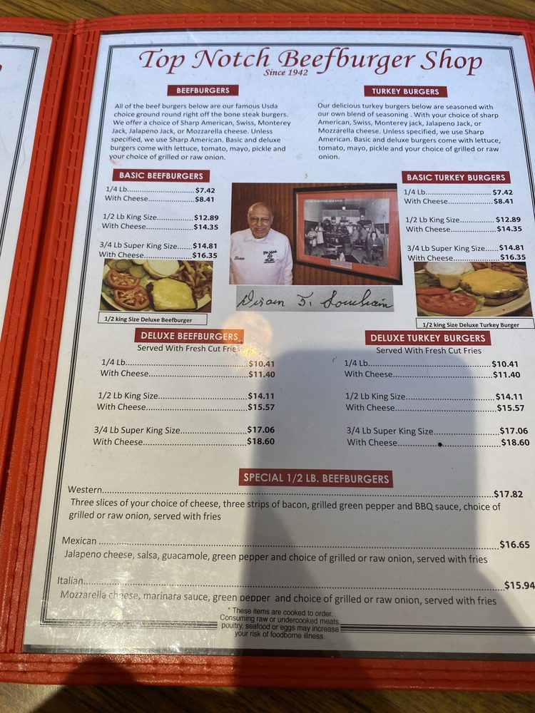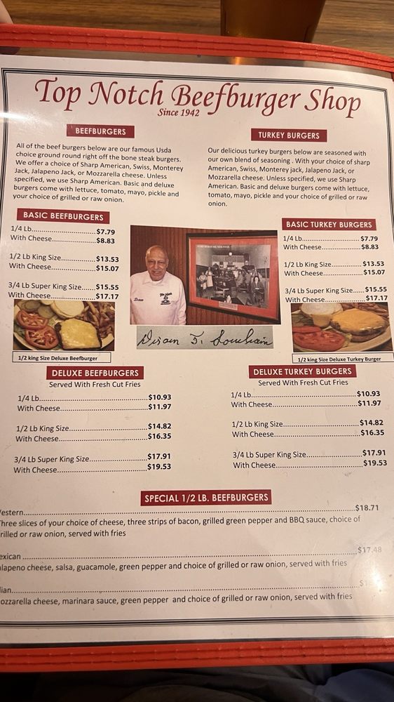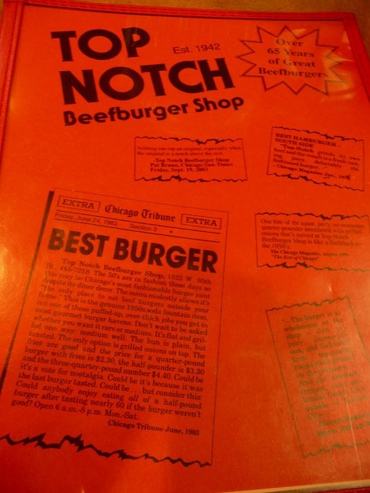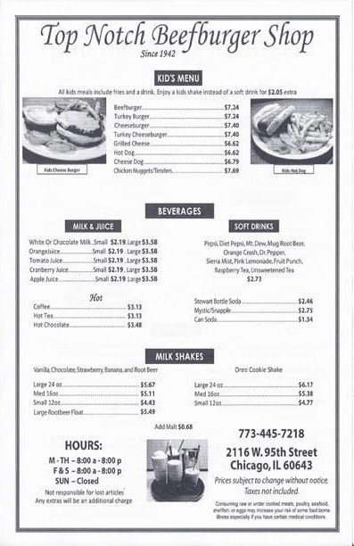 Top Notch Beef Burgers is a burger joint located in Chicago, known for its delicious burgers, salads, and sandwiches. The restaurant offers a range of utilities including delivery, takeout, reservations, and catering services. With options for both beef and turkey burgers, customers can choose from basic burgers or deluxe burgers that come with fries. The menu is straightforward and offers a variety to cater to different preferences. The restaurant provides a casual dining experience with moderate noise levels, making it ideal for groups and families. The convenient location and amenities such as outdoor seating and wi-fi add to the overall dining experience. Overall, Top Notch Beef Burgers is a great spot for a satisfying lunch or dinner with a wide selection of tasty burgers to choose from.